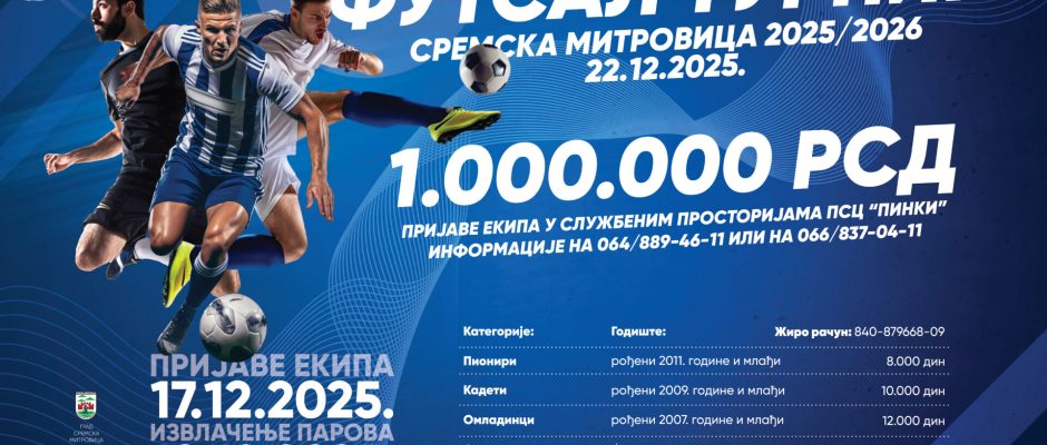 Sremska Mitrovica će i ove zime biti centar regionalnog futsala — 37. Međunarodni futsal turnir 2025/26 počinje 22. decembra, dok su prijave ekipa otvorene do 17. decembra 2025. Izvlačenje grupa zakazano je za 18. decembar. Turnir organizuje PSC „Pinki“, a nagradni fond u seniorskoj kategoriji iznosi 1.000.000 dinara. Kategorije, godišta i kotizacije Kategorija Godište Kotizacija […]